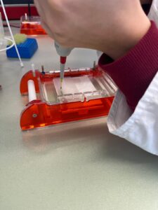 Nach einer Mittagspause in der Campus Mensa (ein Kartoffelgericht hat acht Euro gekostet!) wollten wir unsere DNA nun endlich sichtbar machen. Dafür haben wir die DNA in leere Taschen eines Agarosegels, ein Gel aus einem Pulver einer Rotalge, gefüllt (siehe Abb. 3). Durch die anschließende Gelelektrophorese werden die DNA-Fragmente mithilfe eines elektrischen Feldes ihrer Größe nach getrennt und sichtbar gemacht. Die negativ geladene DNA wandert zum Pluspol, kürzere DNA-Fragmente schneller als längere.