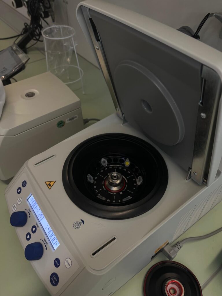 Nach einer kurzen Sicherheitsbelehrung ging es auch schon los: In Zweiergruppen isolierten wir unsere DNA aus Mundschleimhautzellen: Unsere Zellen wurden mithilfe eines bestimmten Puffers aufgelöst und die DNA wurde durch Zentrifugation (siehe Abb.1) von allen zuvor zerstörten Proteinen getrennt. Dann wurden durch Zugabe von Ethanol restliche Verunreinigungen abgewaschen und unsere DNA konnte in Wasser gelöst und für die weiteren Experimente genutzt werden.