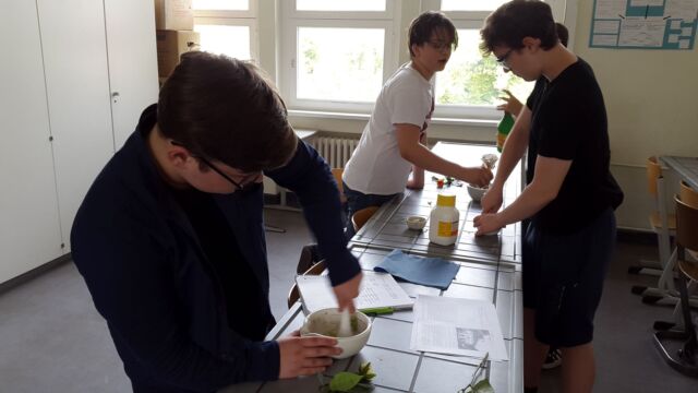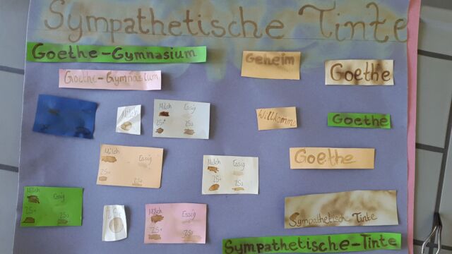 Eine Gruppe widmete sich den sogenannten sympathetischen Tinten, also den Geheimtinten. Hier wurden einige Substanzen auf ihre Eignung getestet. Leider ist der von Goethe benutzte Stoff Cobaltchlorid aufgrund seiner Giftigkeit nicht mehr für den Schülergebrauch zugänglich. Eine andere Gruppe erstellte einen Film über einen Versuch, bei dem Eisendraht in reiner Sauerstoffatmosphäre verbrannt wurde. Eine weitere Gruppe testete Blüten verschiedener Pflanzen auf ihre Reaktion mit Säuren und Laugen. Goethe hatte viele Versuche dazu gemacht und sehr sorgfältig dokumentiert.