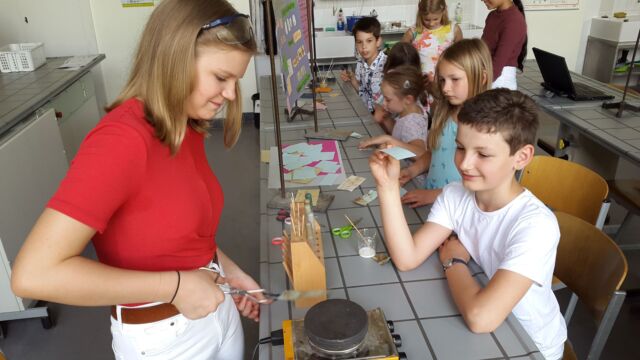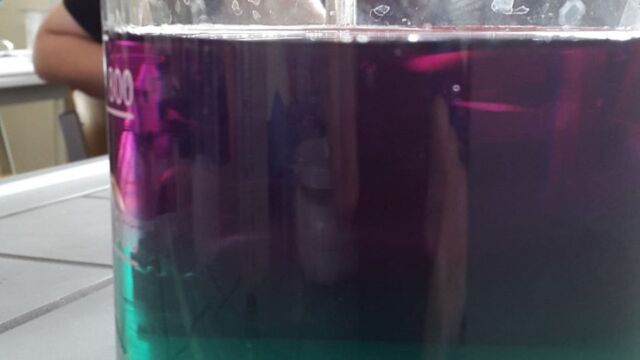 Die Oberstufenschüler erstellten ein sogenanntes mineralisches Chamäleon. Die verschiedenen Oxidationsstufen des Mangans können bei diesem Farbversuch sehr schön gezeigt werden.